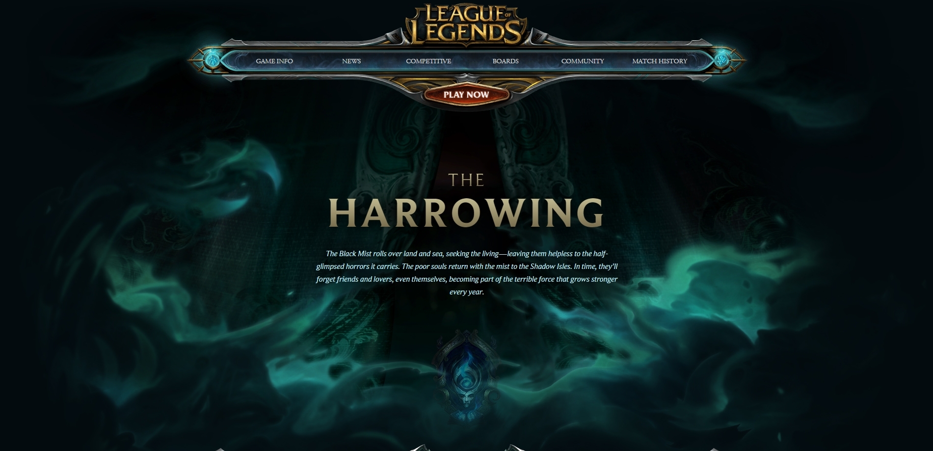 Scroll down just a little, and you get a cinematic to build it up even more, along with a few links you can use to share the video with your friends. Now that the mood is fully set, they start introducing the new features of the Harrowing event. First up are a pair of skins for the champions. These are premium items, so they’re going straight for the flashy stuff to bring in revenue.