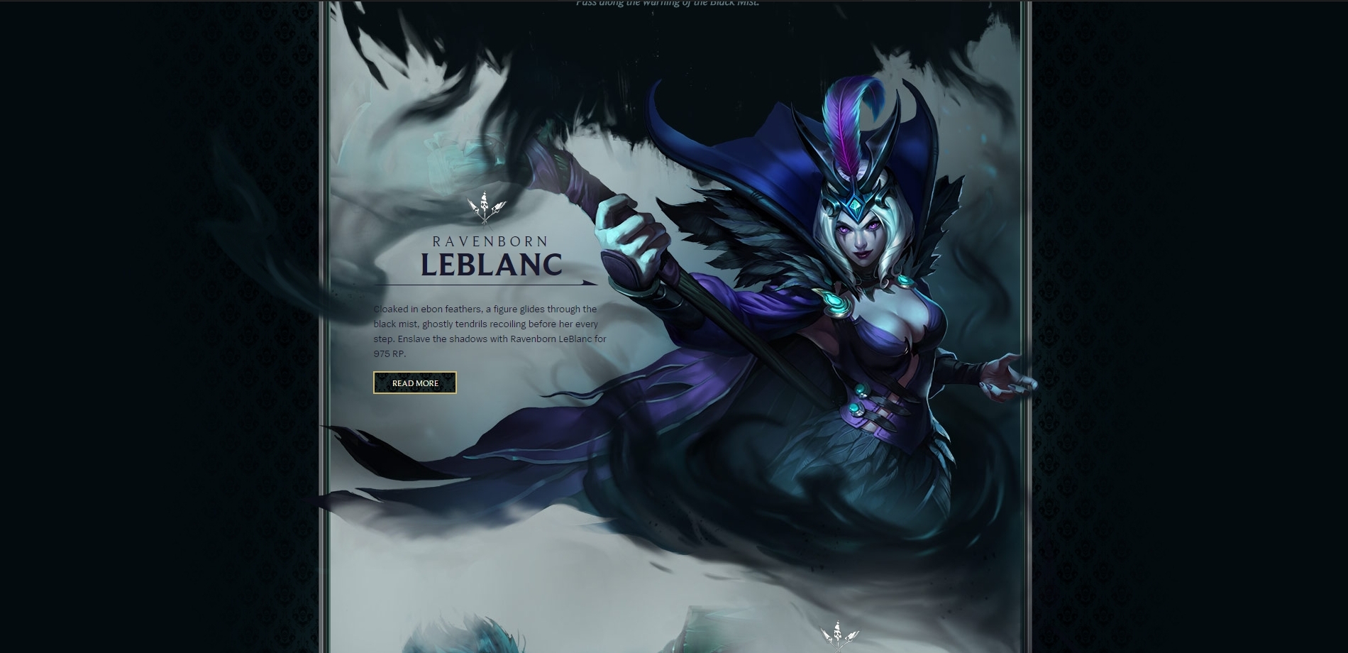 Ravenborn LeBlanc is introduced with some fantastic art and given a price, and there’s a link to read more about that particular skin. If you head over there, there are screenshots of the skin in-game and an animated gif of its idle animation. You also learn that the skin is going into the Legacy Vault on November 4. In other words, this is a skin that can only be purchased during the limited window of this event. She’ll probably be made available for purchase again next year, but she won’t be as new and exciting.
