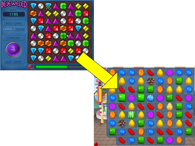 In a tile-swapping match-3 game, your basic verb is to swap tiles, and you can only swap tiles if they’ll make a horizontal or vertical match. Because this is your only verb, all objectives in tile-swapping games are based on matching tiles, whether your goal is to make specific types of matches or to make matches in particular areas of the board, which may become easier or harder depending on the board’s shape. On a micro level of design in this area, difficulty is controlled by how many usable spaces are adjacent to a tile.